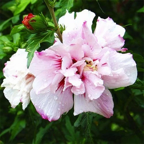 Гибискус сирийский Leopoldii (Hibiscus syriacus 'Leopoldii'). Необычайная красота этого сорта не оставит вас равнодушными! Особый окрас махрового цветка является абсолютным зрелищем. Прежде всего, заметно выделяется темно-красный центр цветка. А сами лепестки нежно-розовые с более интенсивным цветом по краям. Поэтому неудивительно, что этот гибискус зарекомендовал себя во многих садах. С ним вы можете создать тропический рай у себя дома. Диаметр цветков напрямую будет зависеть от частоты обрезки. Чем чаще, тем оно будет производить меньшее количество цветков, но они будут очень крупными, и наоборот. Но обычно цветки размером около 12 см. Живут один день и отмирают, но их так много, что они незаметно сменяют друг друга. Высота растения 1,5-2 м.