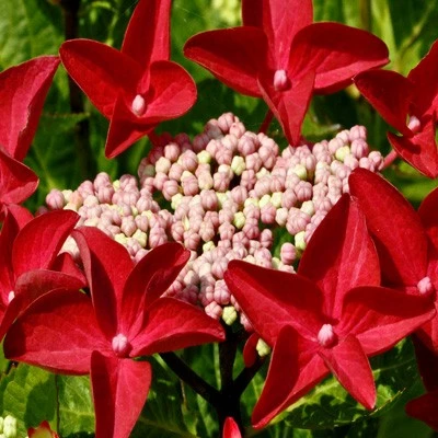 Зонтичная гортензия с редкой плоской формой цветов. Маленькие центральные цветочки желтовато-розового цвета. Маргинальные цветы темно-красные, звездообразной формы. Окраска цветов зависит от кислотности почвы. В щелочной или нейтральной почве цветы будут розовые, но чем выше кислотность, тем краснее будет цвет лепестков. Цветёт с июля по август.