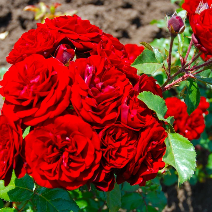 Великі кисті махрових темно-червоних квіток розпускаються з кулястих бутонів. Цвіте все літо і осінь, квітки красиво контрастують з темно-зеленим листям. Н-0,5 м.