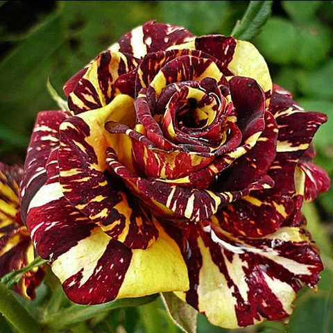 Роза чайно-гібридна Абракадабра. Це одна з найбільш незвичайних троянд коли-небудь вирощених. Цвіте дуже яскраво і приголомшливо. Весь квітка покритий численними смужками і плямами різних відтінків від легких і сильних жовтих з рожевим і фіолетовим. Опис: Квітки великі (10-12см), розташовані поодиноко або в суцвіттях, махрові, з високим центром, пелюстки загостреної форми. Аромат легкий. Листя зелене глянсова. Срезочной сорт, але може рости у відкритому грунті. Зимостійкість висока. Висота куща до 100см. Роза відрізняється винятковою привабливістю і шармом.Оплата та доставка
